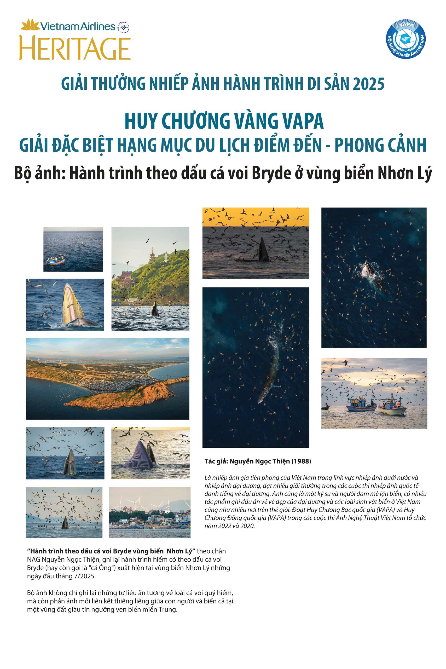 Qua quá trình chấm chọn, bộ ảnh “Hành trình theo dấu cá voi Bryde ở vùng biển Nhơn Lý” của nhiếp ảnh gia Nguyễn Ngọc Thiện đã nhận được sự đồng thuận cao của Ban giám khảo để nhận giải Đặc biệt cho hạng mục Du lịch - Phong cảnh và Huy chương vàng VAPA.